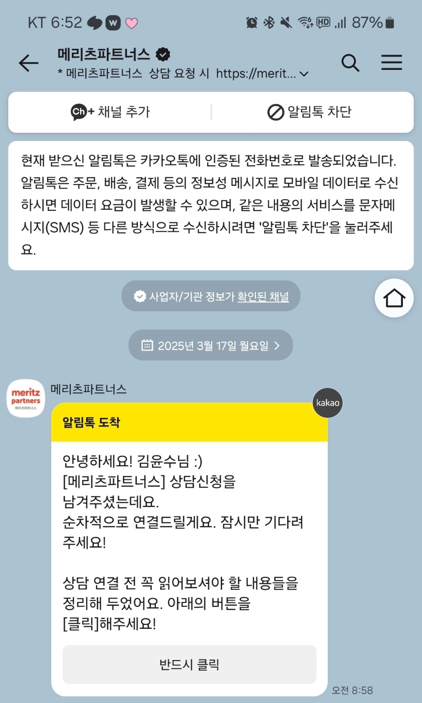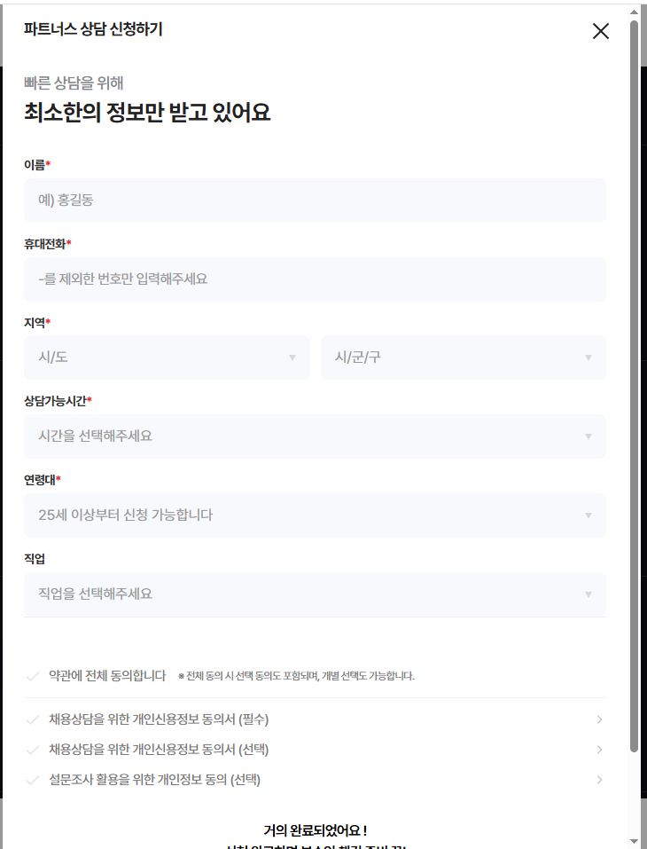 메리츠 파트너스 신청 방법은 매우 간단합니다. 아래 링크를 통해 1. 메리츠 파트너스 홈페이지에 접속 후 무료상담 신청, 그리고 2. 인적사항을 입력하시면 다음날 3. 메리츠 파트너스 담당자에게 연락이 옵니다.