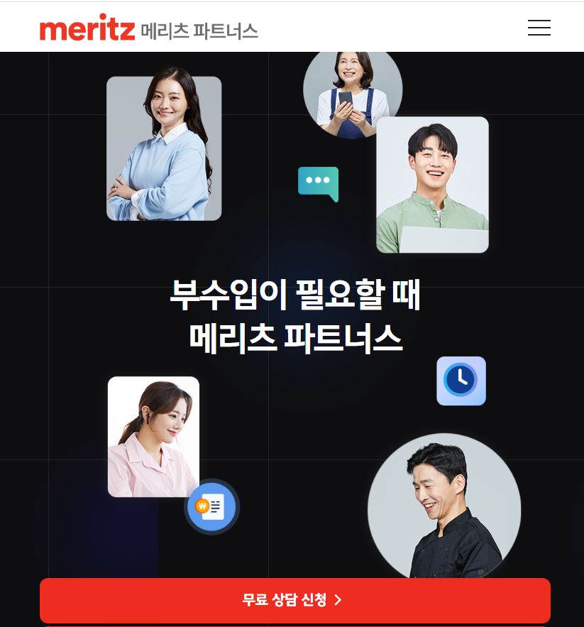 메리츠 파트너스는 메리츠화재에서 제공하는 부업 형태의 보험설계사 프로그램입니다. 기존의 보험설계사와는 달리 실적에 대한 부담 없이 지인 또는 본인의 보험을 재설계하고 신규 가입을 도와주면서 수당을 받는 형태의 새로운 부업입니다. 실제로 본인 및 가족, 지인의 영업만으로도 부가적인 소득 창출이 가능하고, 초기 투자 비용이 없으며 온라인 교육과 멘토 지원 등으로 초기 진입 장벽이 높지 않다는 특징이 있습니다.